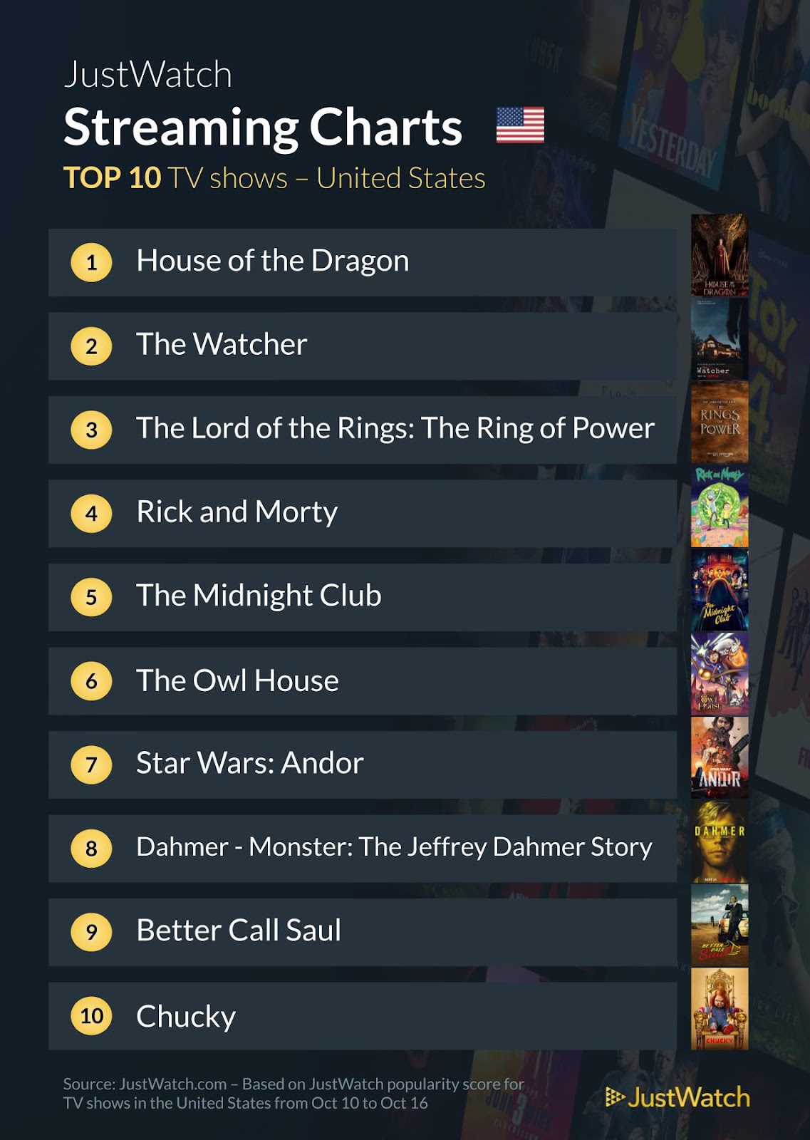 Other titles include Rick and Morty, The Midnight Club, The Owl House, Star Wars: Andor, Dahmer – Monster: The Jeffrey Dahmer Story, Better Call Saul, and Chucky.